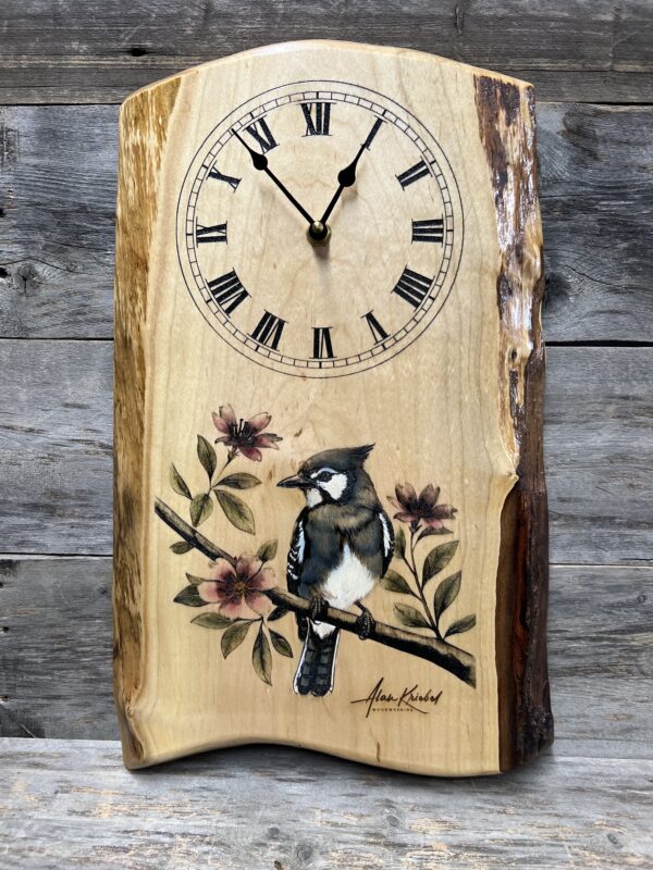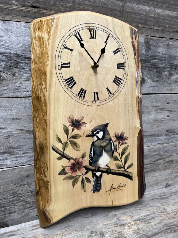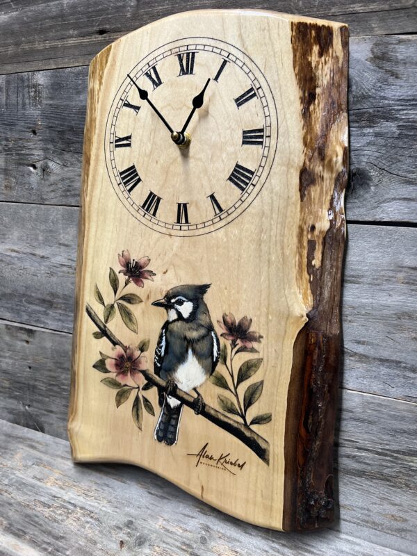 Add natures beauty to your walls with this elegant Blue jay live-edge wall clock. Handcrafted from Live-edge Maple, featuring a vibrant Blue jay perched on a blooming branch— brought to life with stunning lasered and hand-painted detail.