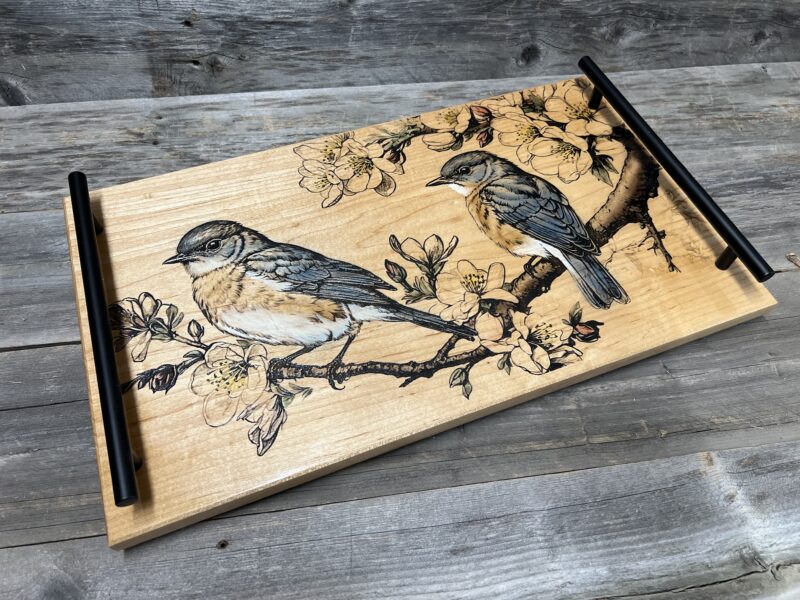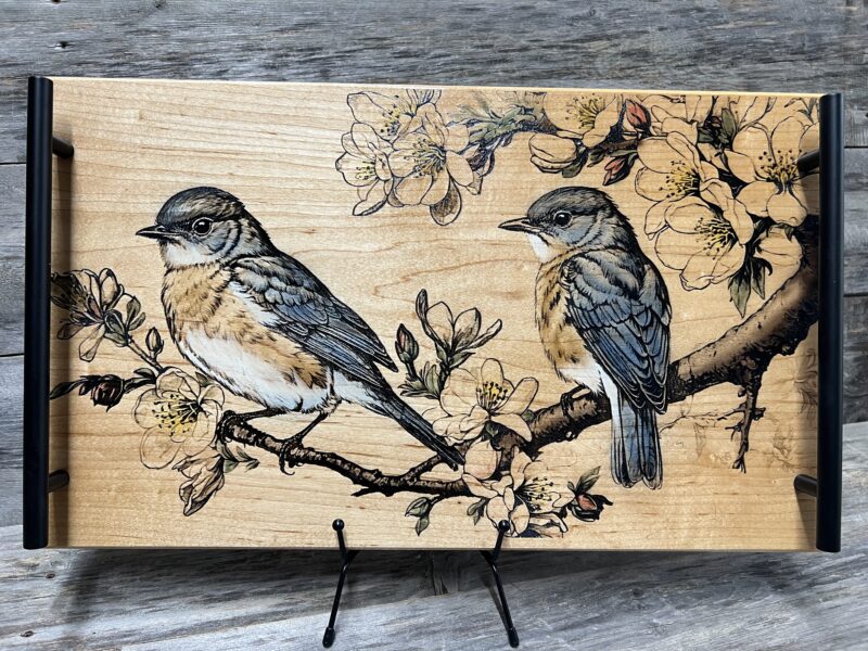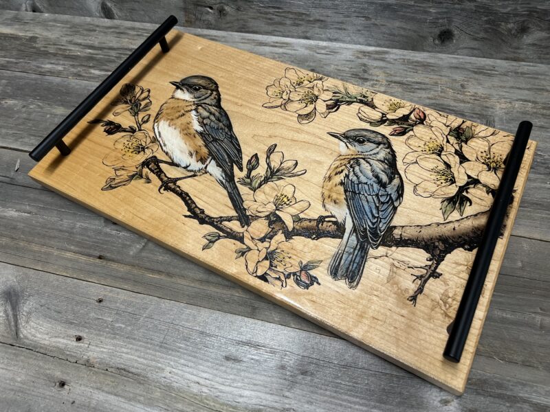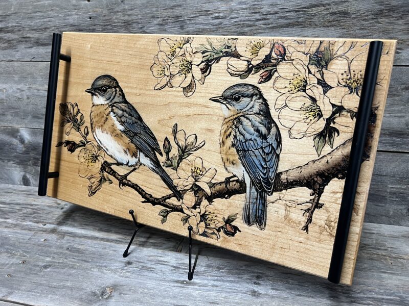 Bring beauty to your gatherings with this charming Bluebird charcuterie board and serving tray. Brought to life with stunning lasered and hand-painted detail. Handcrafted from premium hard maple wood, featuring a delicate pair of bluebirds perched among blooming apple blossoms in exquisite detail.