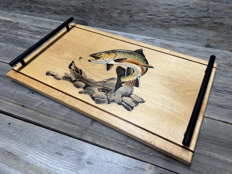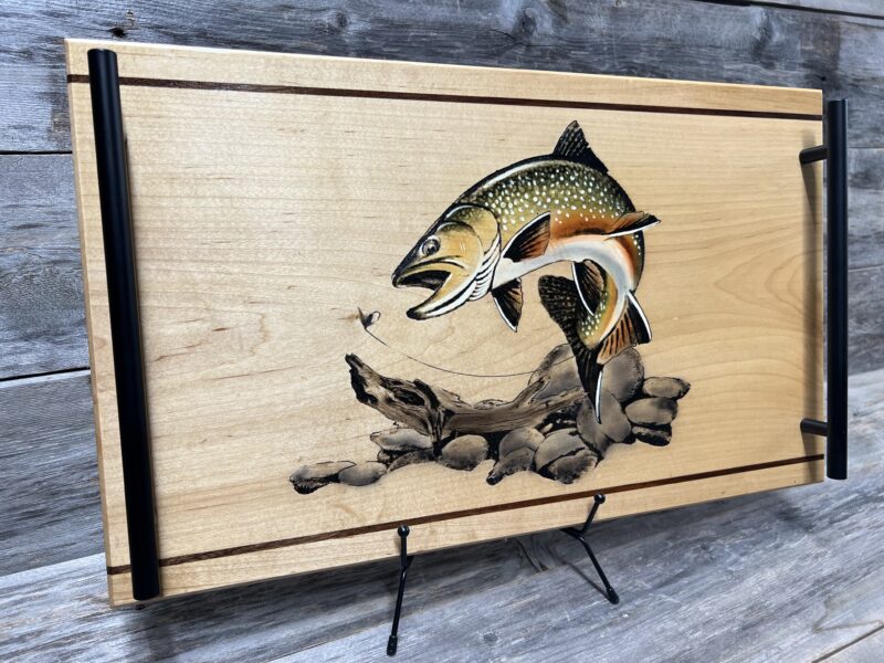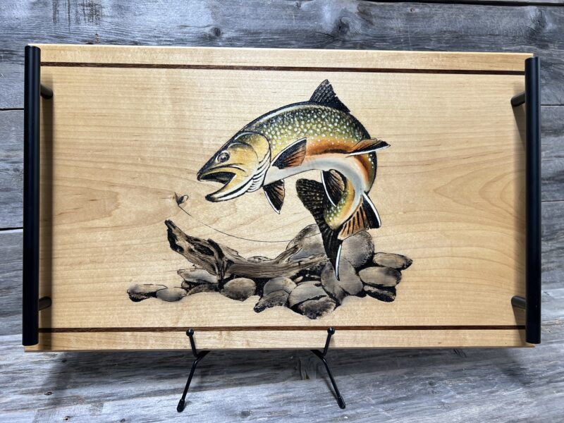 Hook the spirit of the wild stream! This handcrafted tray showcases a majestic brook trout — captured in stunning lasered and hand painted artistry.