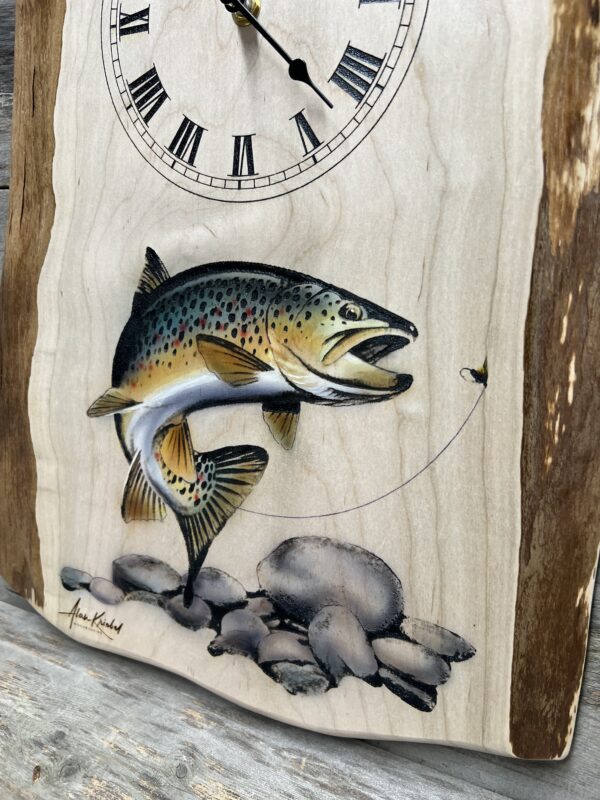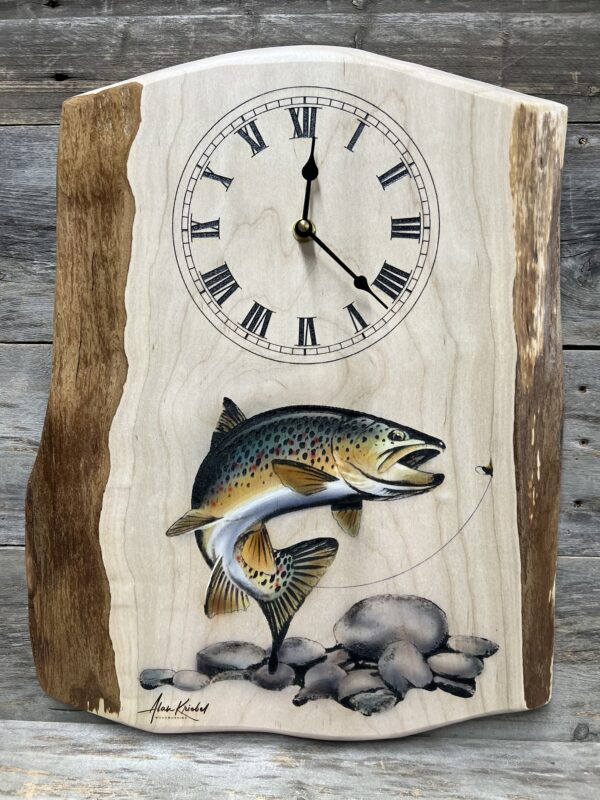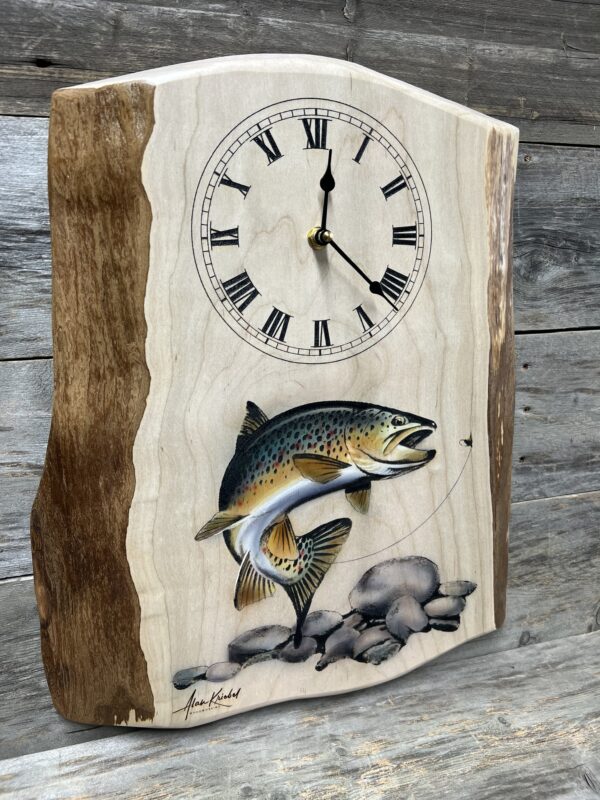 Add timeless charm to your space with this stunning Brown trout live edge wall clock. Handcrafted from natural live edge maple, featuring a beautifully detailed brown trout— brought to life with stunning lasered and hand-painted detail.