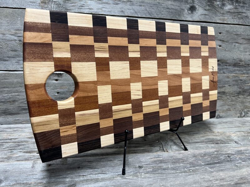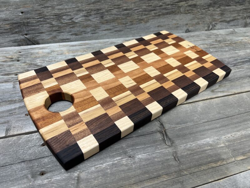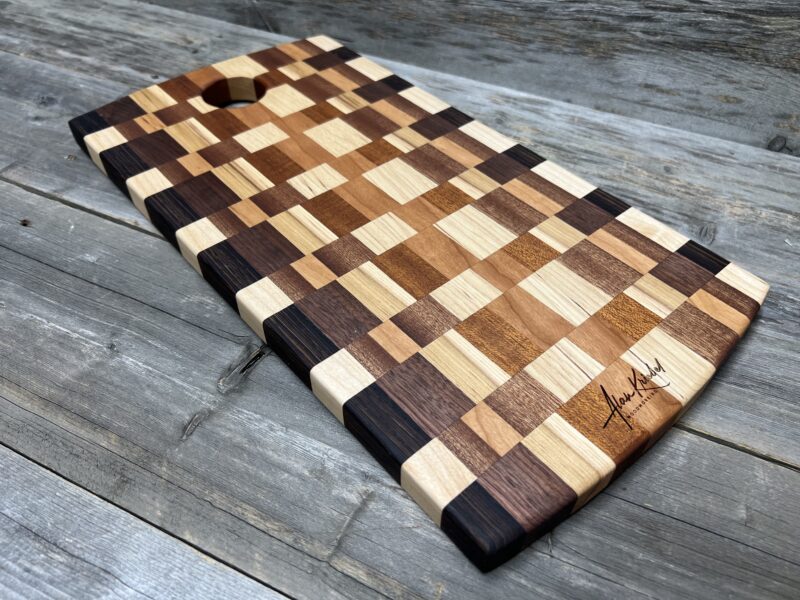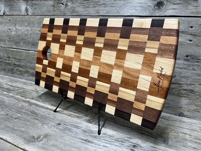 This handcrafted Checkered pattern cutting board features a classic, timeless pattern meticulously assembled from premium hardwoods, including rich walnut, warm maple, golden tones, and contrasting dark accents.