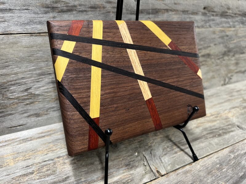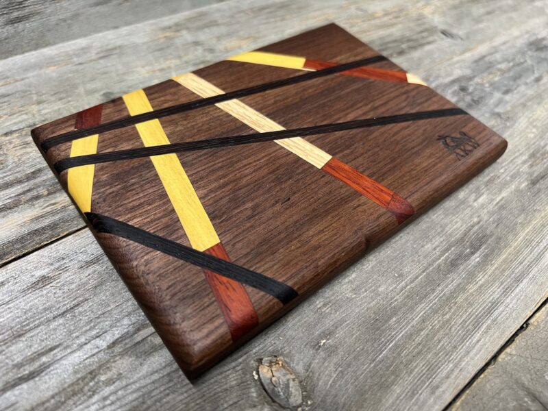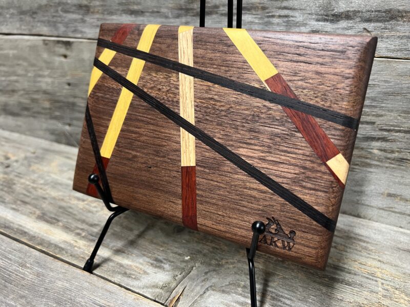 The Chef Petite Cutting Board (5” x 7”) from Alan Kriebel Woodworking is a beautifully handcrafted piece that combines premium Walnut with rich yellow, red, and black inlay stripes in a striking artistic design. Each board is one-of-a-kind due to the natural variations in the wood.