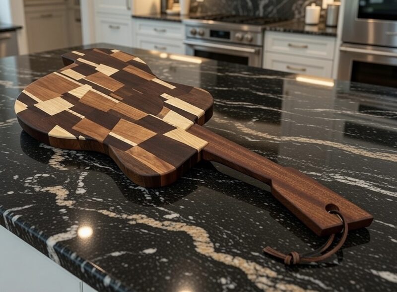 Handcrafted by Alan Kriebel Woodworking, this unique guitar-shaped charcuterie and cutting board is a stunning fusion of form and function.