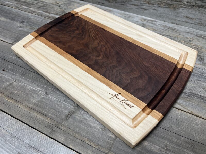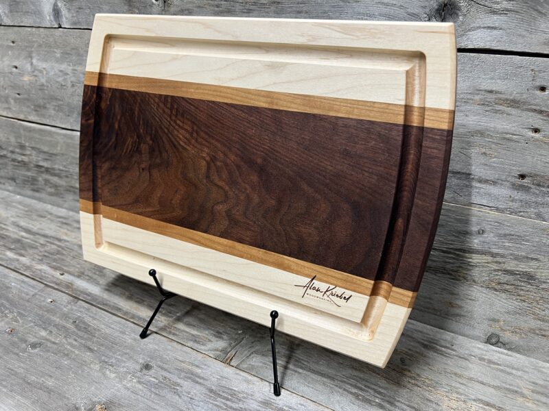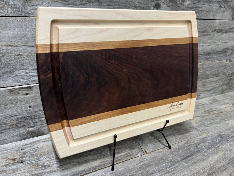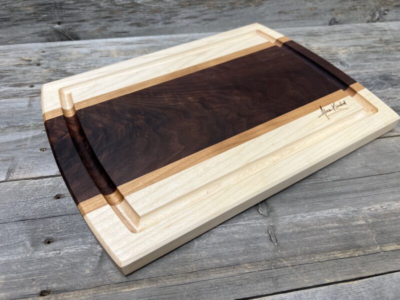 Beautifully crafted from rich black walnut, light maple, and Cherry hardwoods, this board features a striking walnut center with contrasting maple borders, a deep juice groove, and gently arched sides for comfortable handling. A durable, timeless kitchen essential and heirloom-quality piece.
