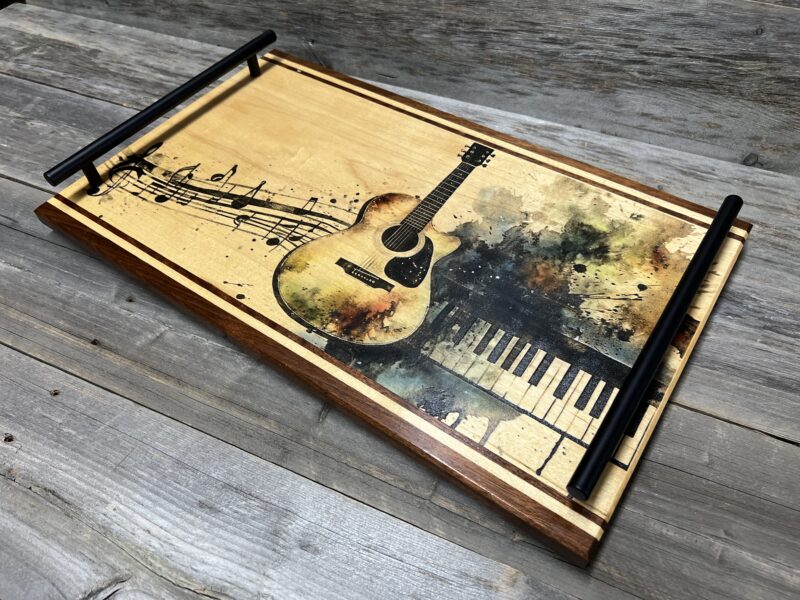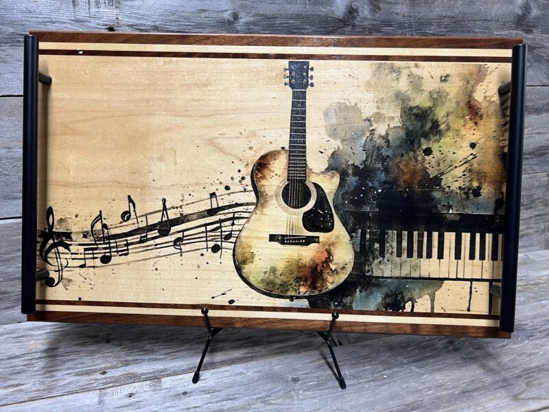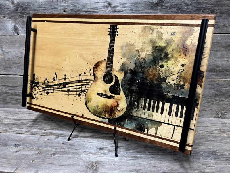 Handcrafted from premium hard maple with rich walnut borders, this board features a captivating hand-painted design: a beautifully detailed acoustic guitar centered amid flowing musical notes and staff lines, transitioning into a shadowy piano keyboard. Creating a moody, artistic vibe on the light maple grain.Â
