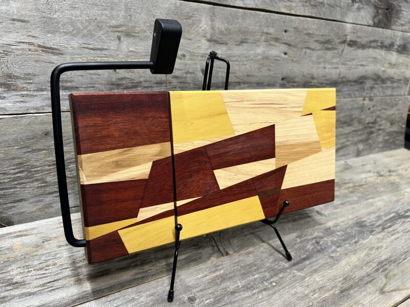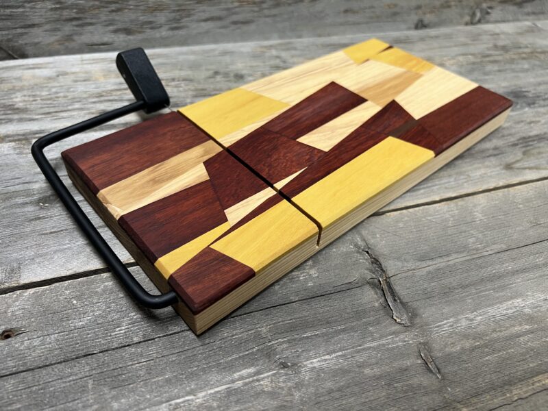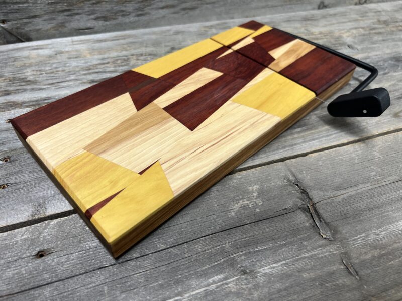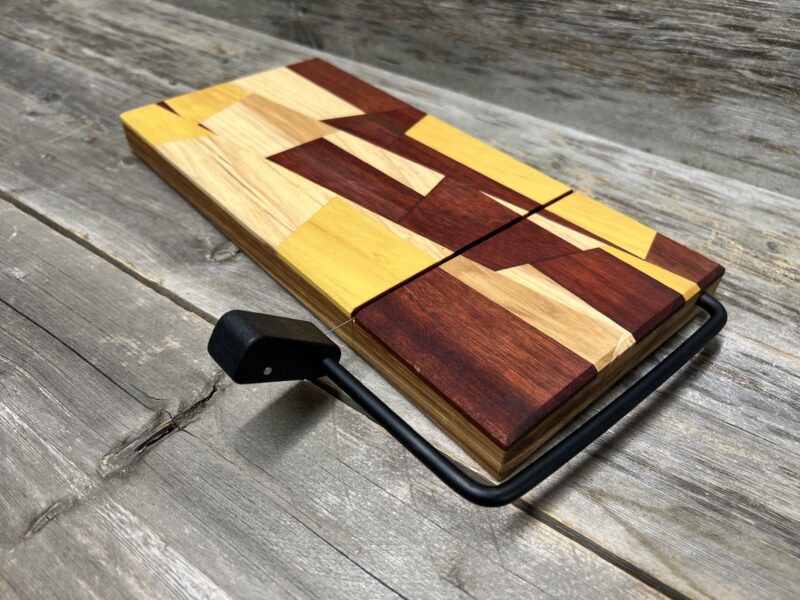 The intricate mosaic design creates bold, abstract shapes across the surface, showcasing natural grain variations and vibrant color contrasts for a modern, one-of-a-kind look. Featuring a durable stainless steel wire cutter with a sleek black handle for precise, effortless slicing.