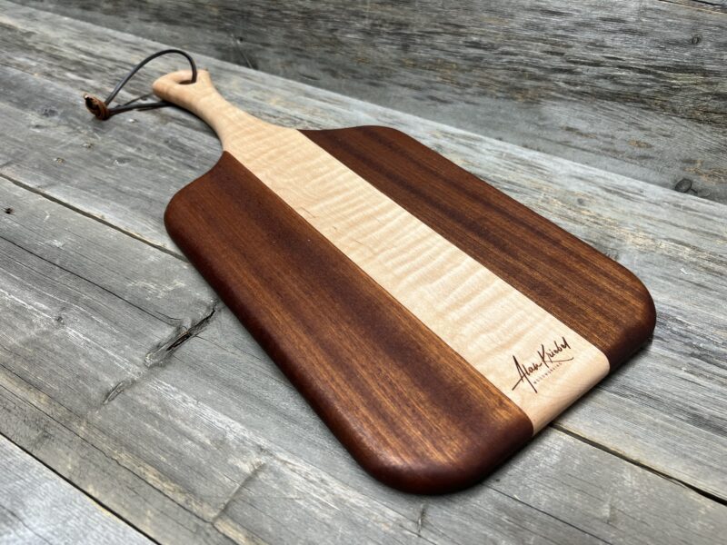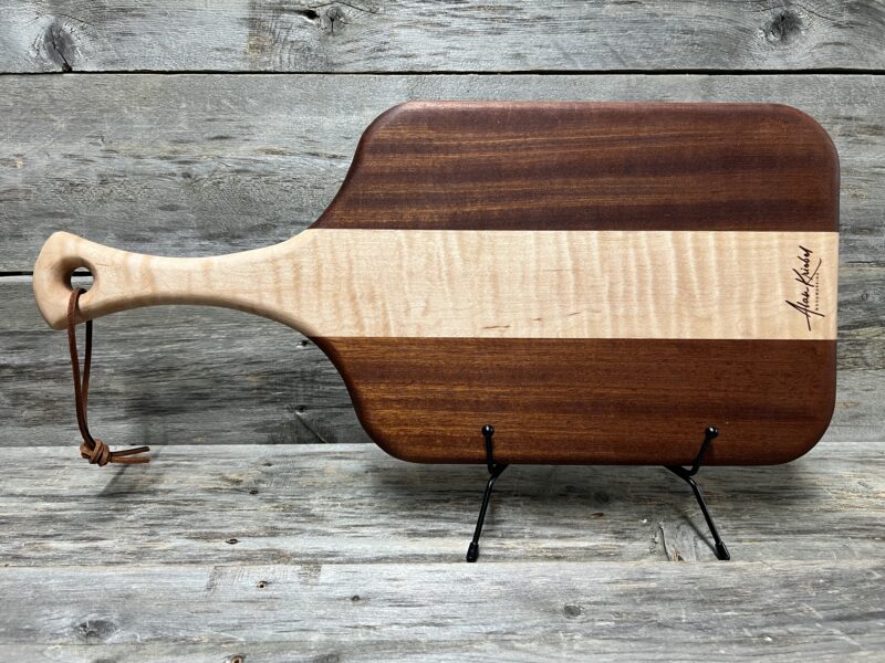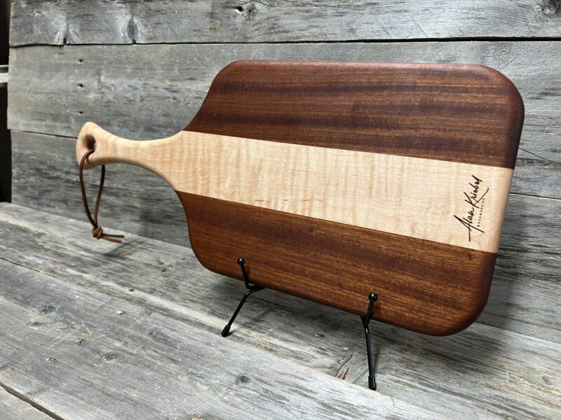 Sapele & Tiger Maple Cutting/Charcuterie Board Handcrafted by Alan Kriebel Woodworking This striking board features rich Sapele framing a bold center stripe of Tiger Maple with its dramatic wavy figuring that shimmers in the light. The ergonomic Tiger Maple handle includes a leather strap for easy hanging. Durable, food-safe finished with mineral oil/beeswax blend. Perfect […]