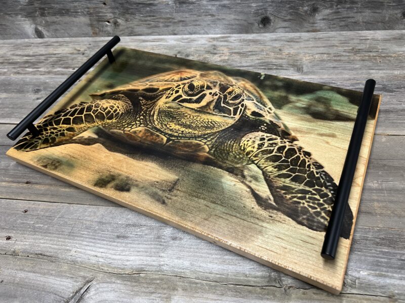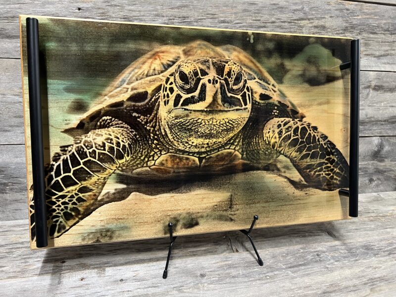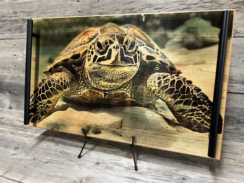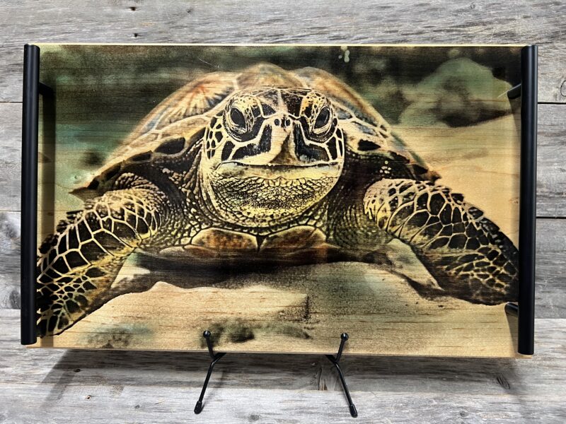 Elevate your gatherings with this striking detailed sea turtle design. Captured in stunning lasered and hand painted artistry. Beautifully handcrafted from premium hard maple. Features sleek black stainless steel handles for easy carrying and protective rubber feet.