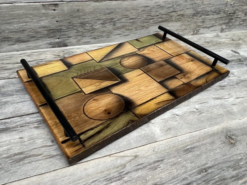 Elevate your entertaining with bold, contemporary style!  This striking tray features a dynamic geometric design of interlocking shapes, circles, and angles. Lasered and hand painted for rich, layered depth, and earthy tones that highlight the natural wood grain. Handcrafted from white oak with a durable, food-safe finish for safe serving. Equipped with sleek black stainless […]