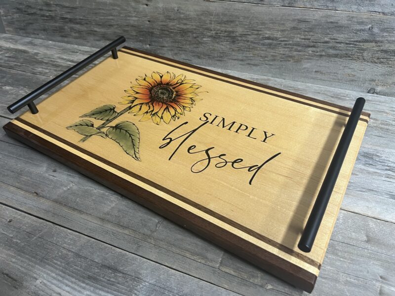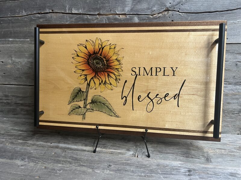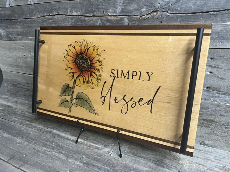 Simply Blessed Charcuterie & Serving Tray features a beautiful large sunflower with vibrant orange-yellow petals positioned on light natural hard maple wood surface. Brought to life with stunning lasered and hand-painted detail.