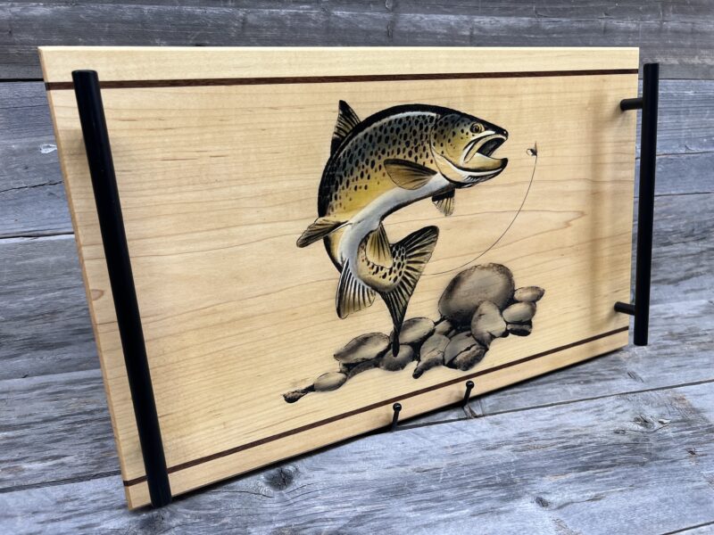 Hook the spirit of the wild stream! This handcrafted tray showcases a majestic brown trout — captured in stunning lasered and hand painted artistry.