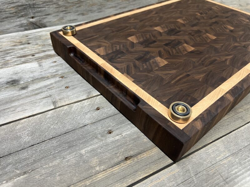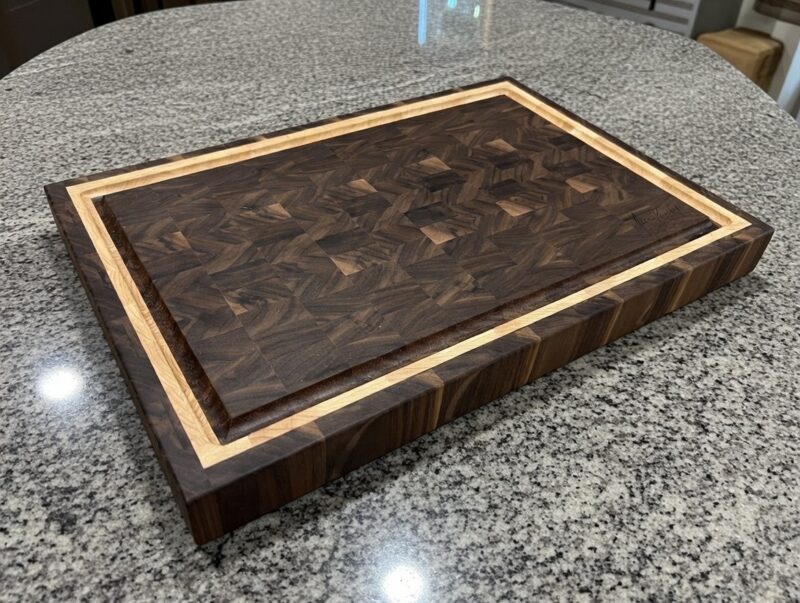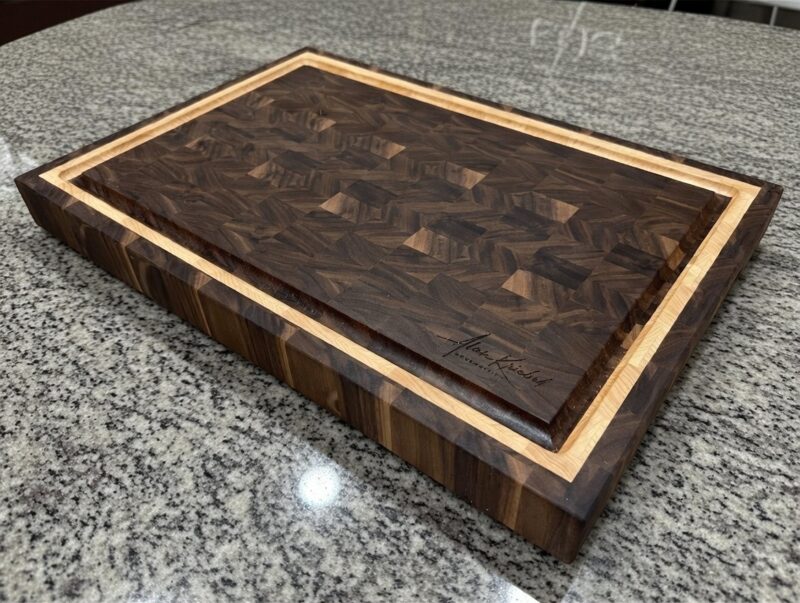 Framed by a striking walnut border with maple accents for elegant definition. Built-in finger holds make it easy to lift and carry, while solid brass/rubber feet protect countertops and add stability. Hand-finished with food-safe mineral oil and beeswax for a smooth, long-lasting sheen. Signed for authenticity.