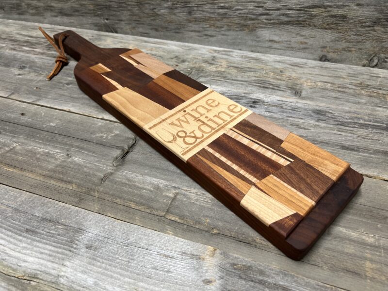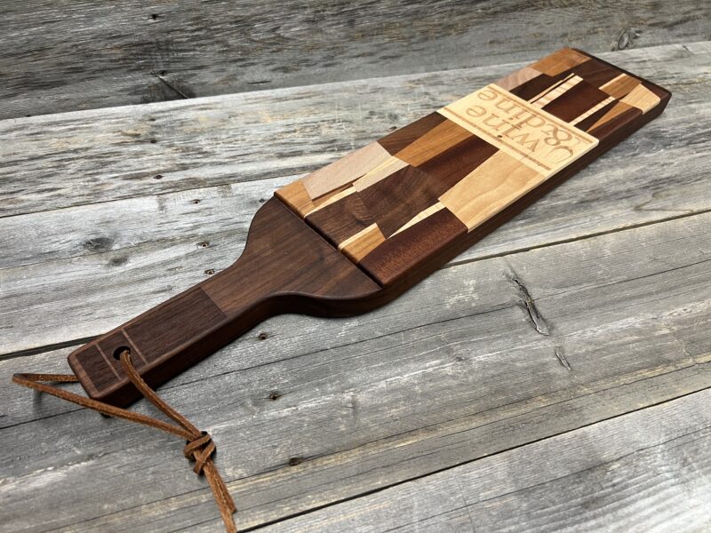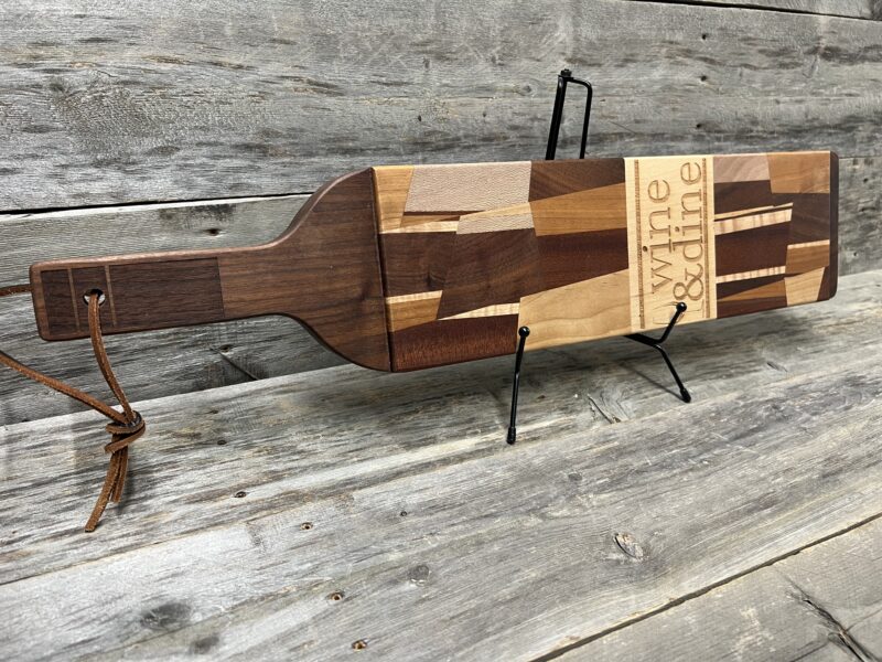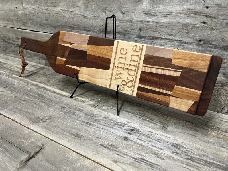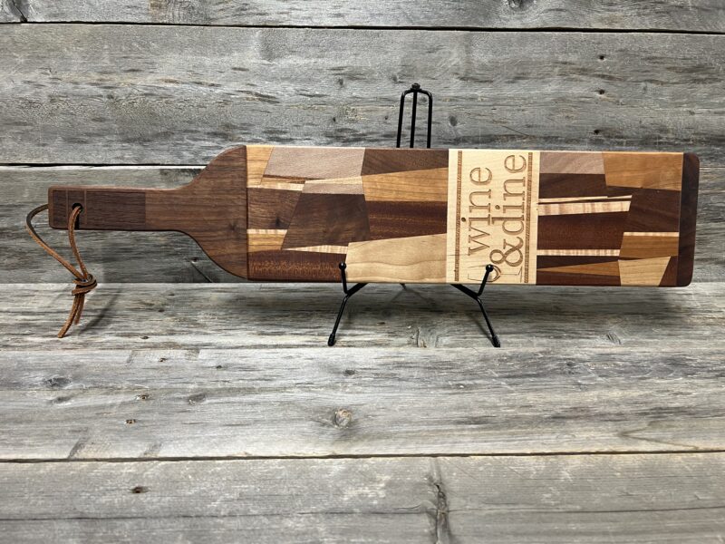 This elegant bottle-shaped charcuterie board is perfect for wine lovers and entertaining. Crafted from rich walnut with contrasting stripes of maple and sapele, the eye-catching geometric inlay forms a stylized wine bottle silhouette. Boldly engraved with “Wine & Dine” brings playful sophistication to any gathering.